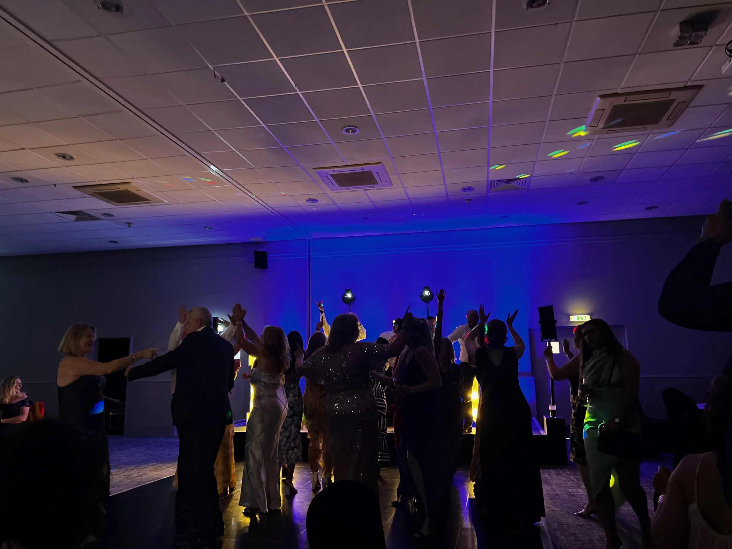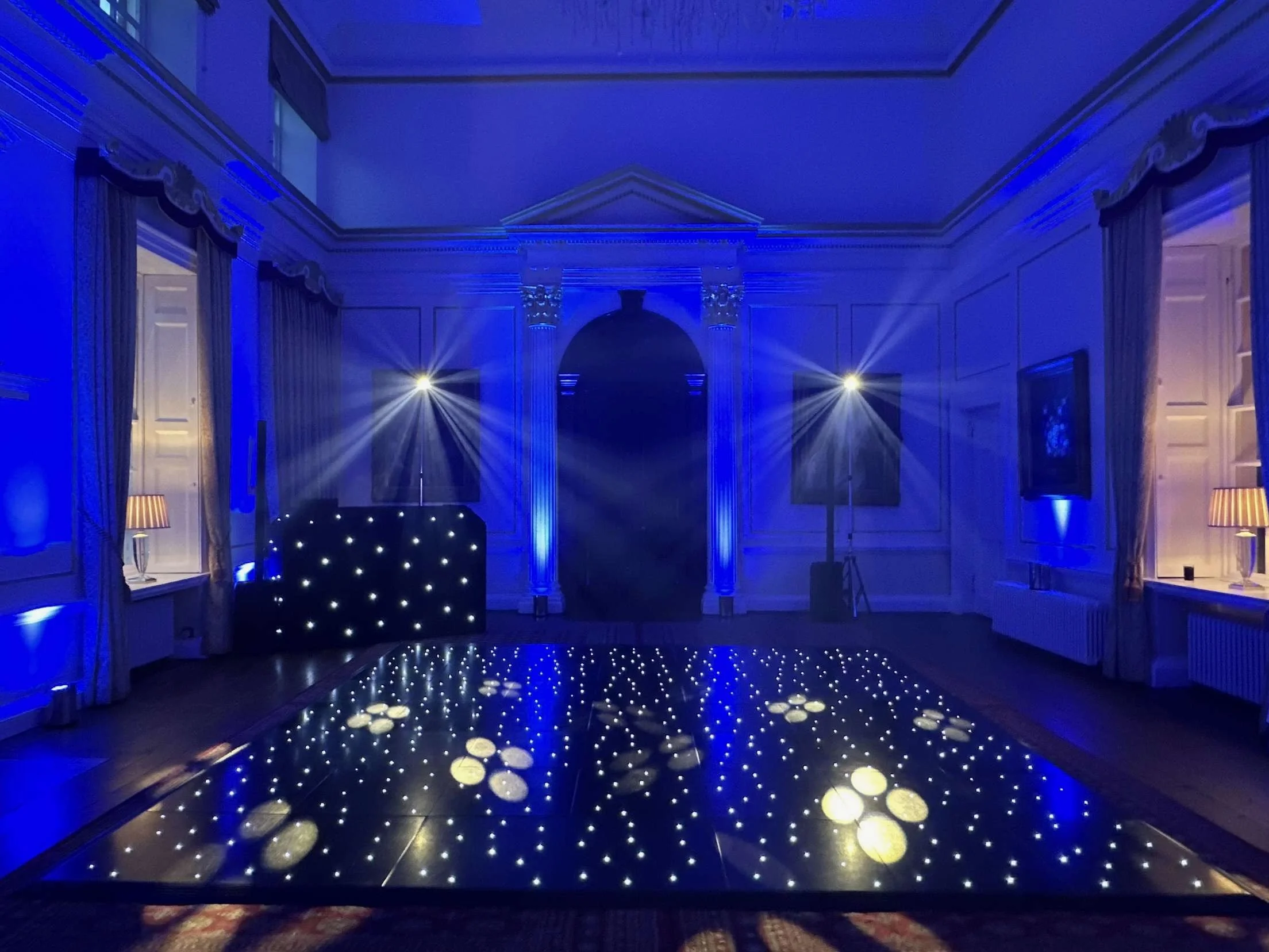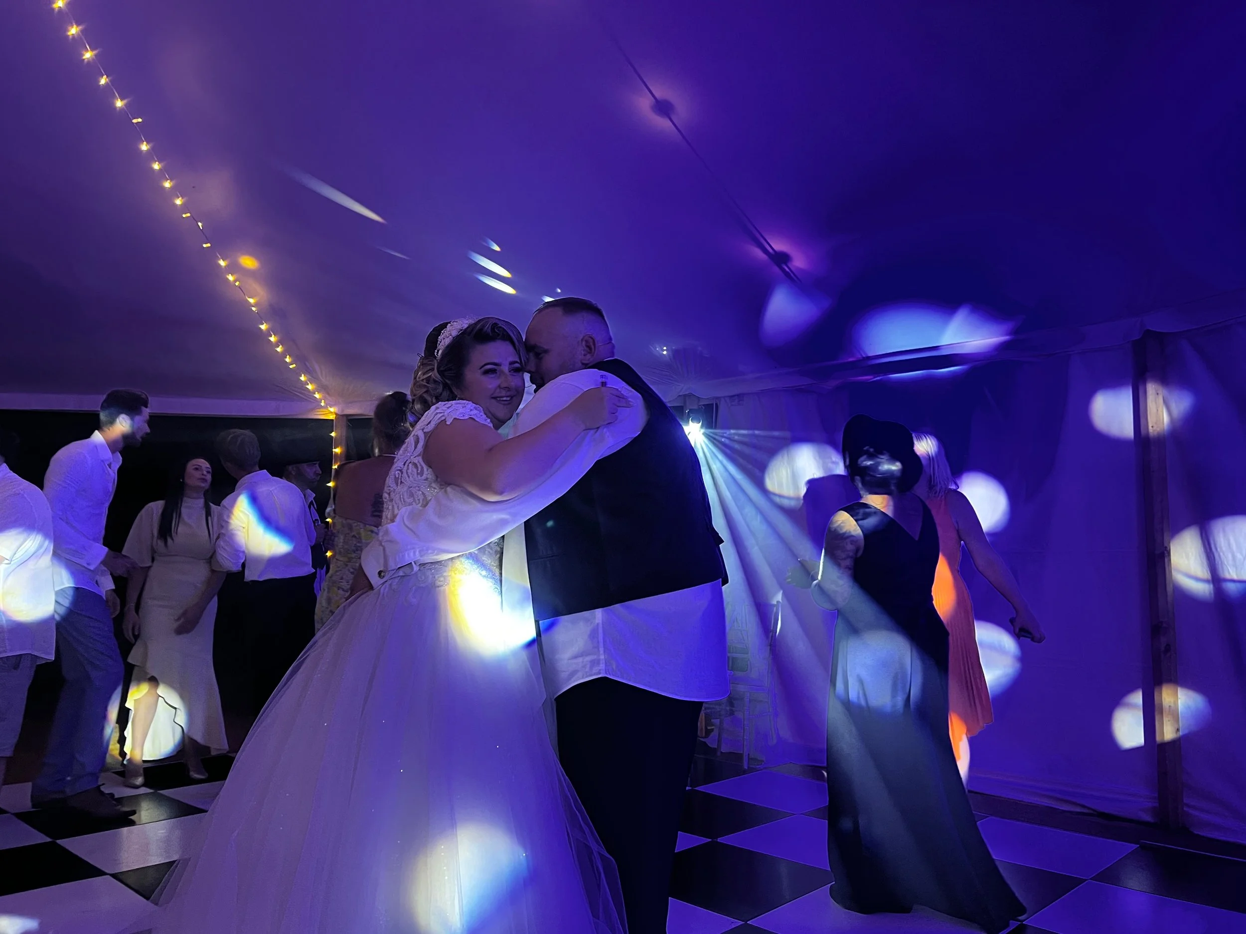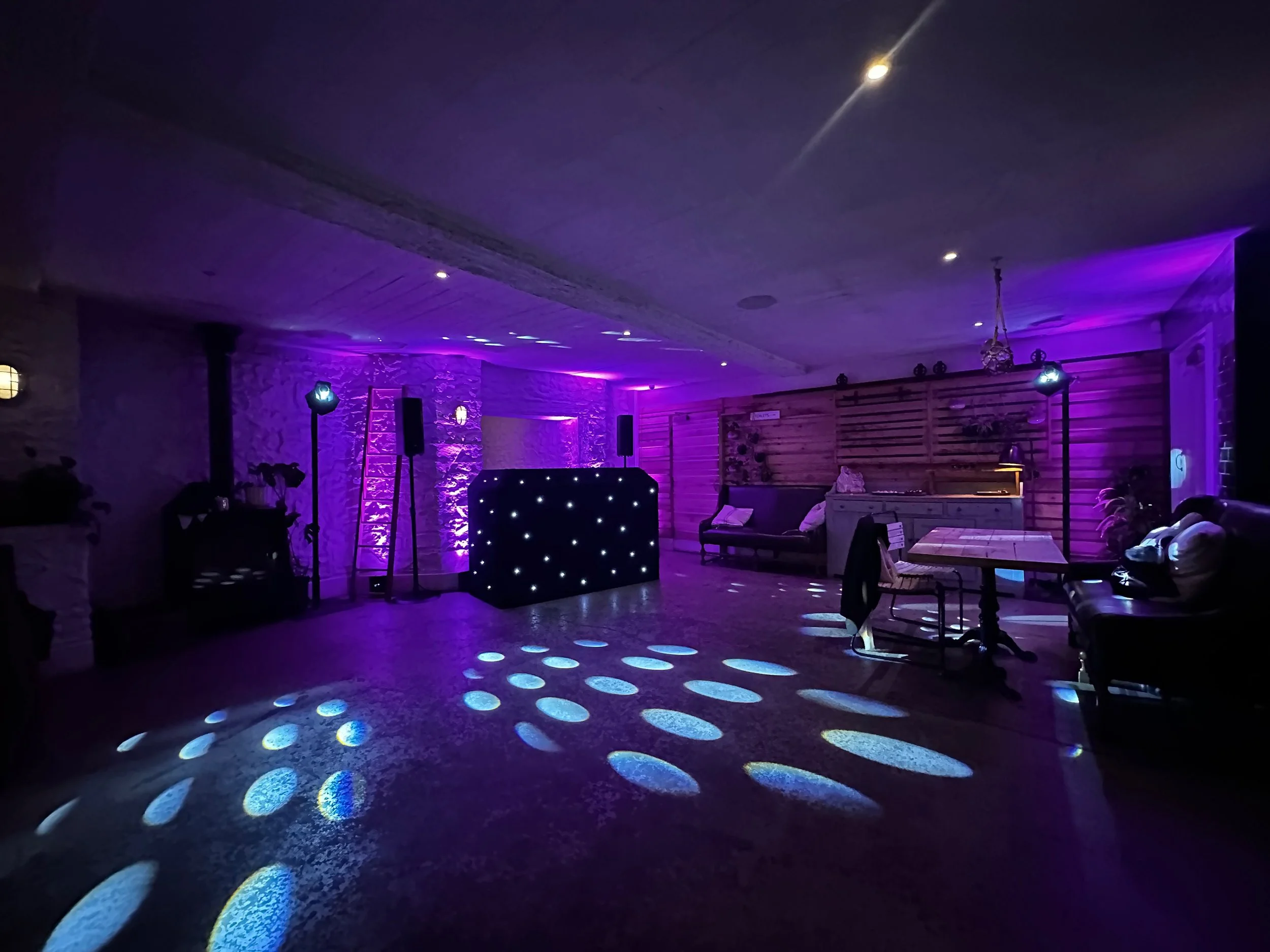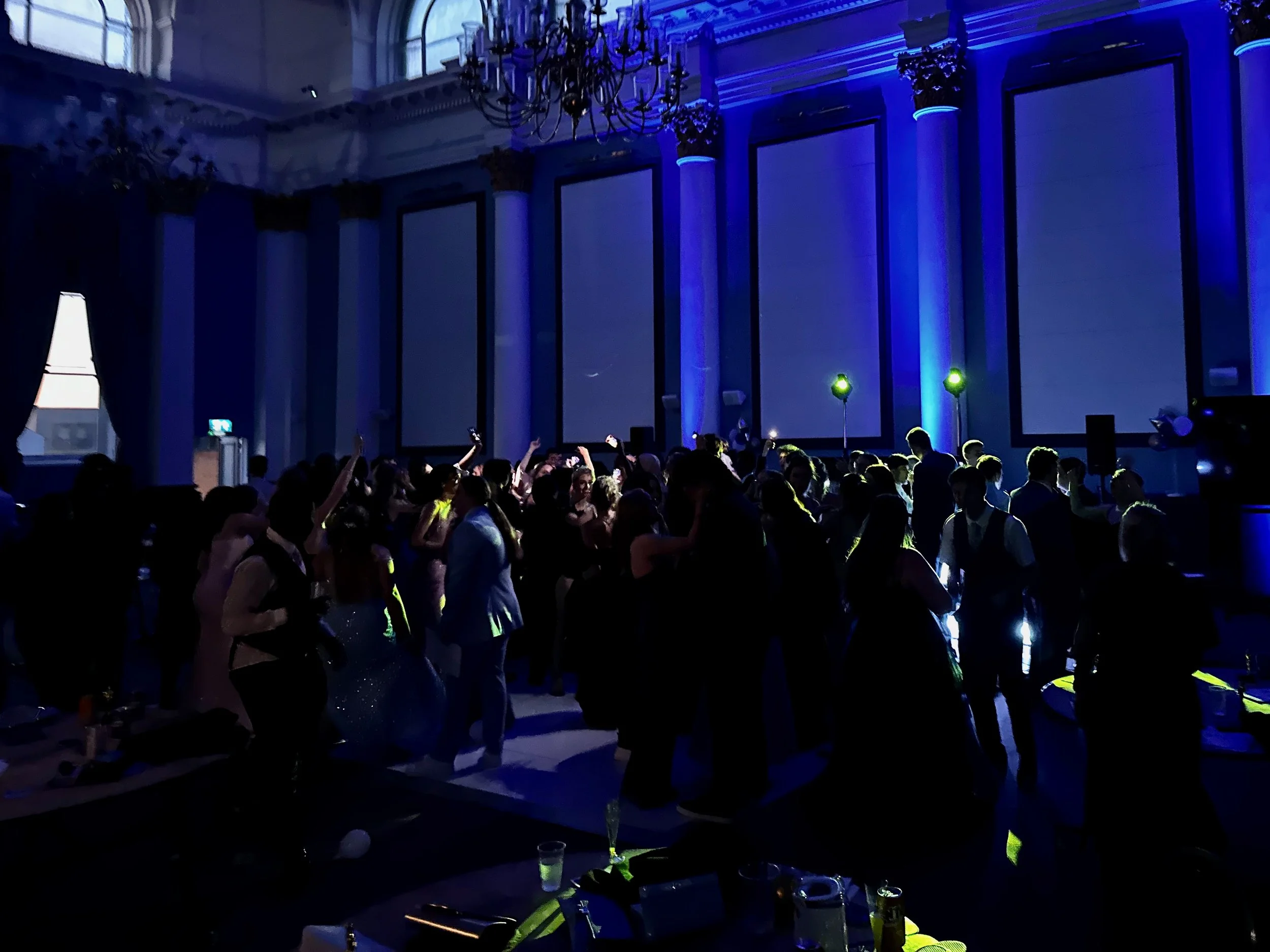 This package includes a high-quality sound system capable of handling up to 300 guests, along with two moving-effect lights and four uplights behind the DJ setup — all fully computer-controlled (no harsh flashing during your first dance 😅 or mismatched colours at your corporate event). You’ll also get a choice of a sleek black or starlit 6ft DJ booth — and, of course, one of our top-tier DJs bringing the fun, energy, and music your guests actually want to hear.