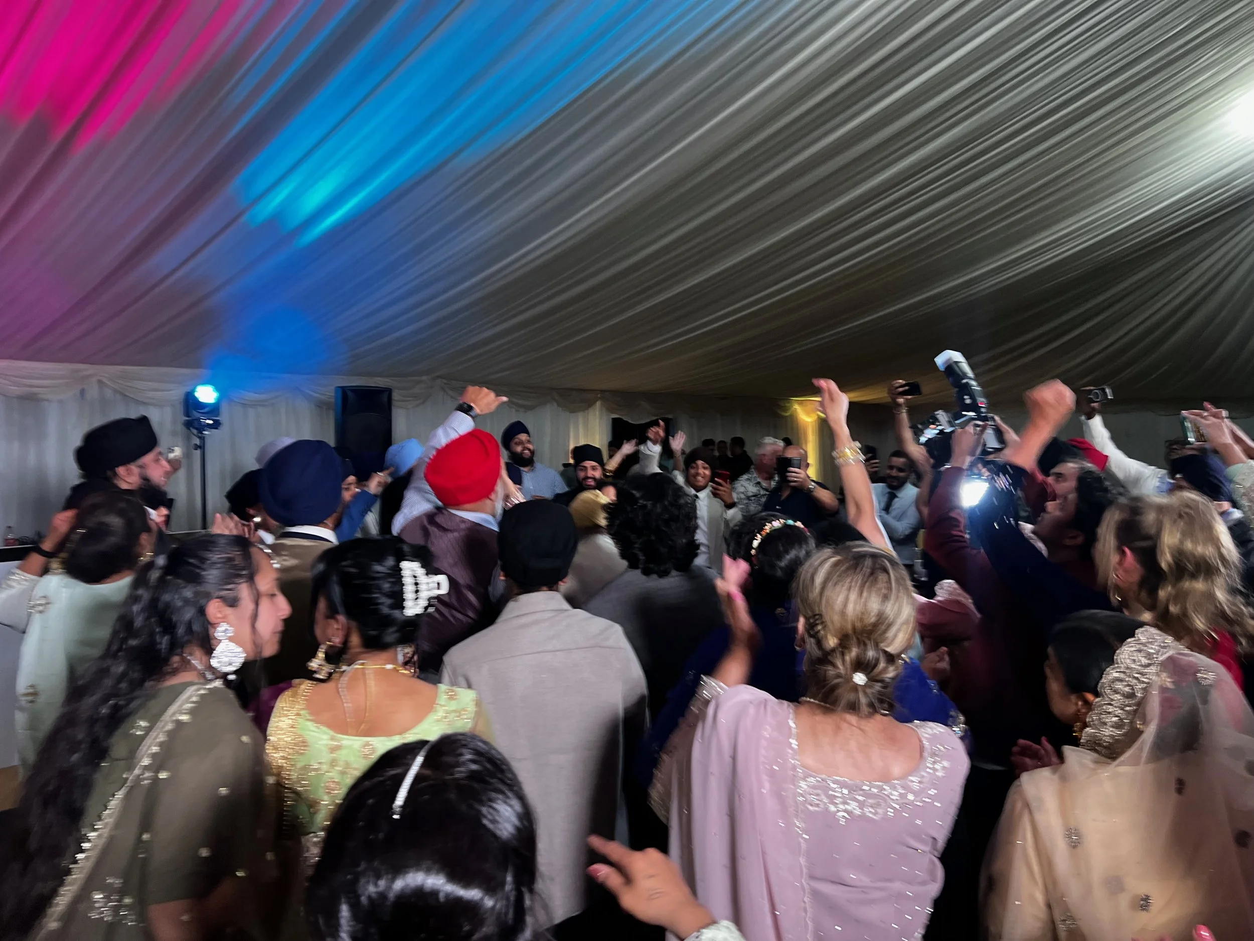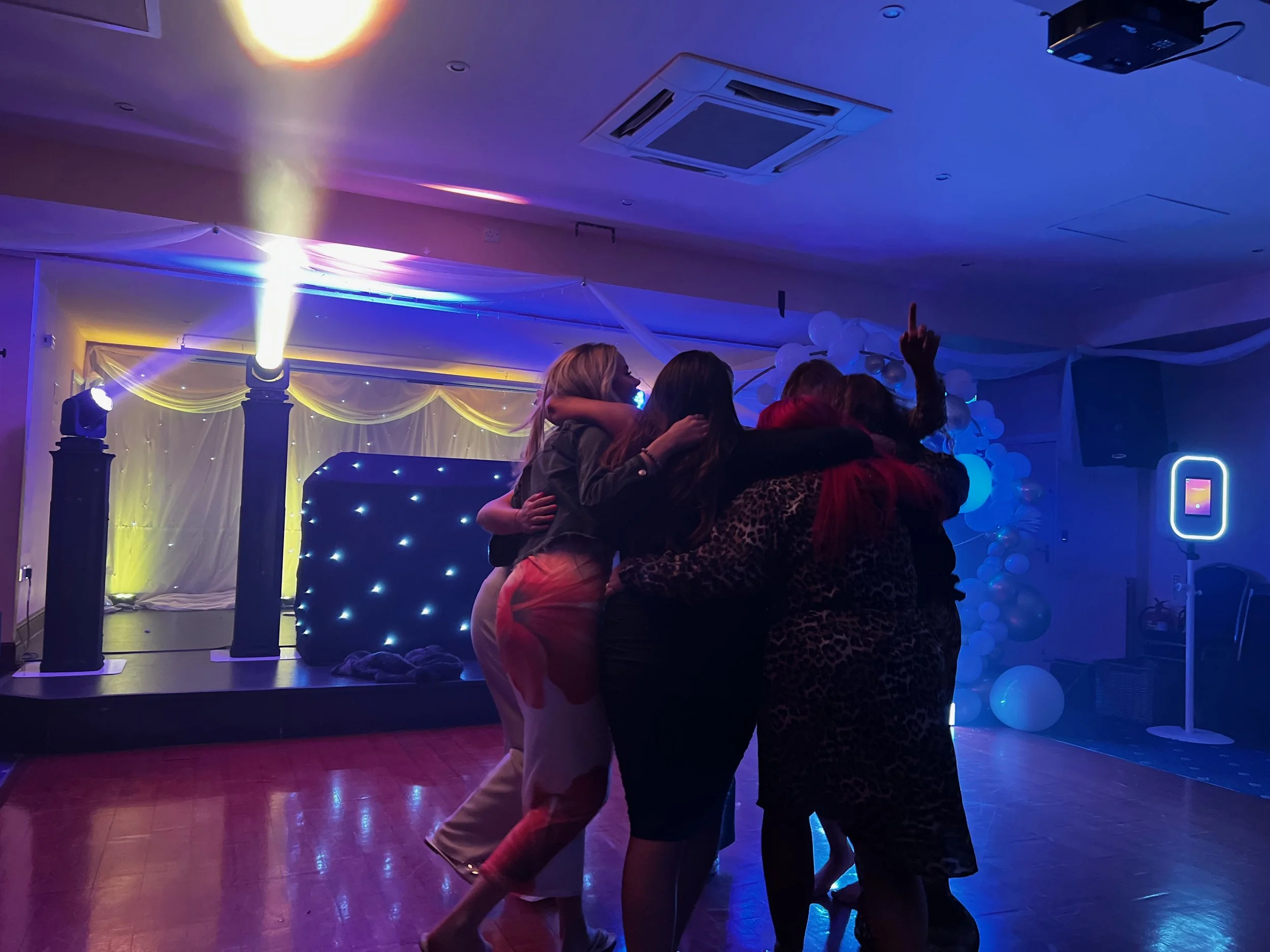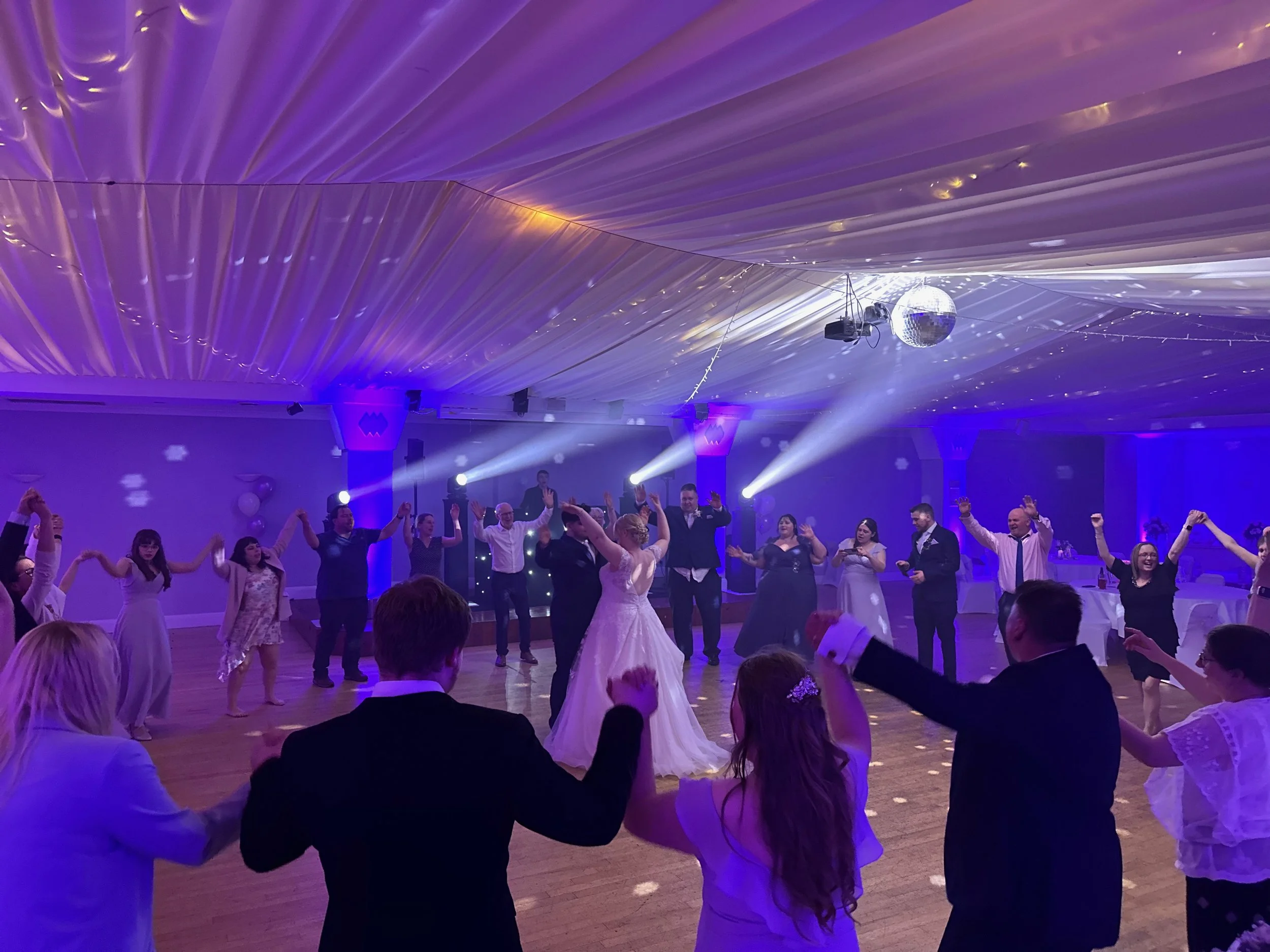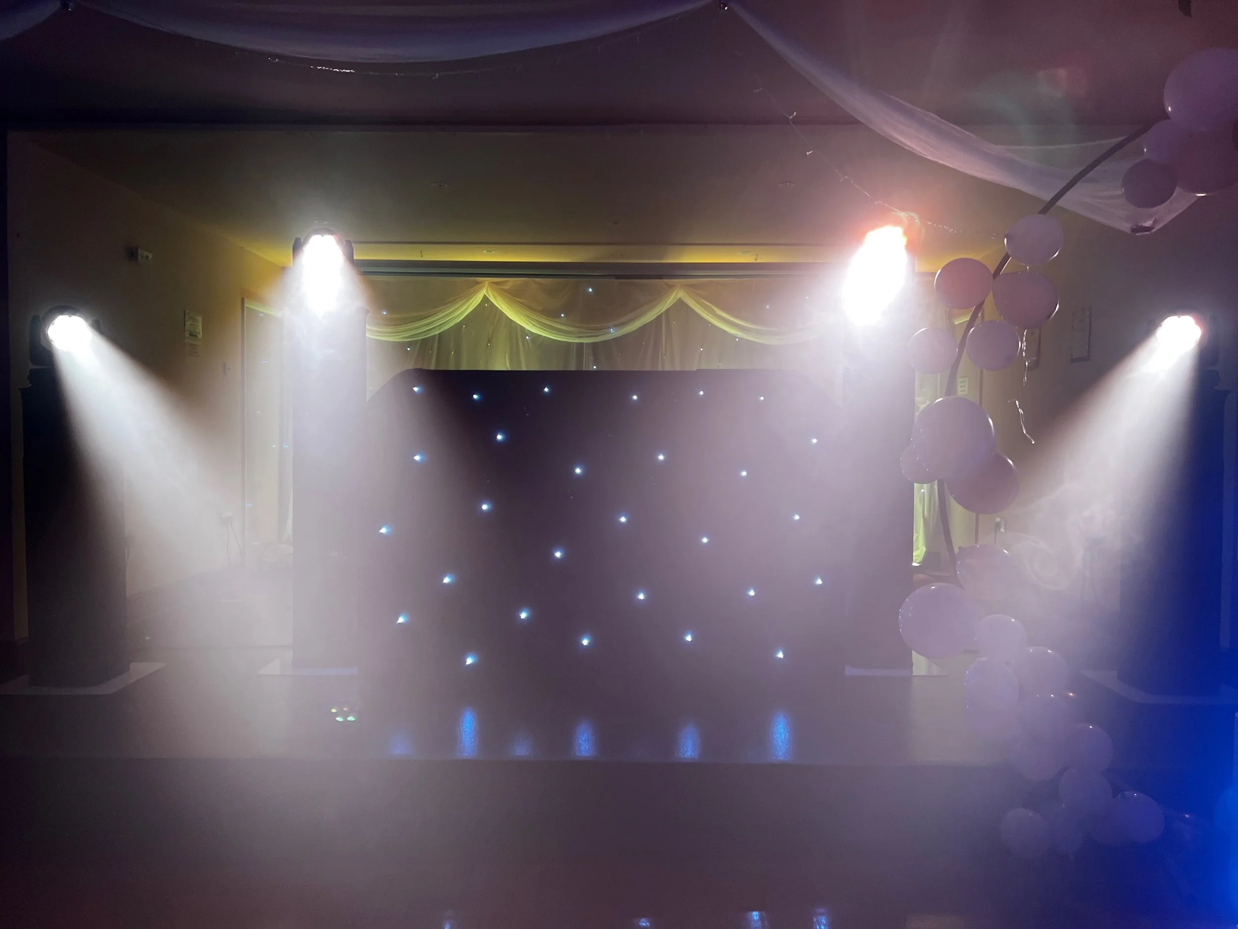 This package includes a high-quality sound system capable of handling up to 300 guests, along with four moving-head lights that dance around the room and four uplights positioned behind the DJ setup — all fully computer-controlled (no harsh flashing during your first dance 😅 or mismatched colours at your corporate event). You’ll also get your choice of a sleek black or starlit 6ft DJ booth — and, of course, one of our top-tier DJs bringing the fun, energy, and music your guests actually want to hear.